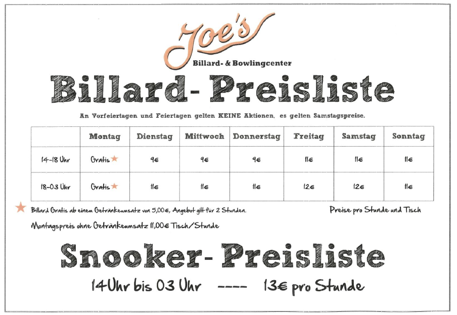 Billard ist ein Sport, der eine ausgereifte Technik, viel Gefühl, höchste Konzentration und viel mentale Stärke benötigt. In unserem Billardcenter ist der Billardclub BC Joe’s beheimatet, welcher den Spitzen- sowie auch den Breitensport fördert. Die 1. Mannschaft des Billardclubs spielt seit 2009 in der 2. Bundesliga.